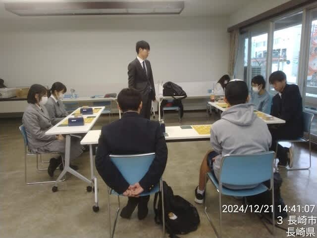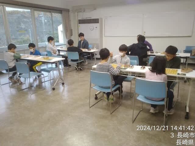 2024-12-23 佐々木大地七段指導対局開催報告 教室 12月21日(土)長崎支部子供教室でに佐々木大地七段の指導対局が行われました。 今回はまず来年1月に長崎市で開催される全国高校新人戦の長崎県代表を中心に高校生が、 その後で小中学生が指導を受けました。1人1人丁寧にご指導下さり、大変感謝します。 指導対局と並行して行われた参加者同士による自由対局の模様です。 この日は学生名人・全国レーティング選手権者の北川馨さんも来場し、指導対局を行いました。 佐々木先生、北川さん、どうもありがとうございました。
